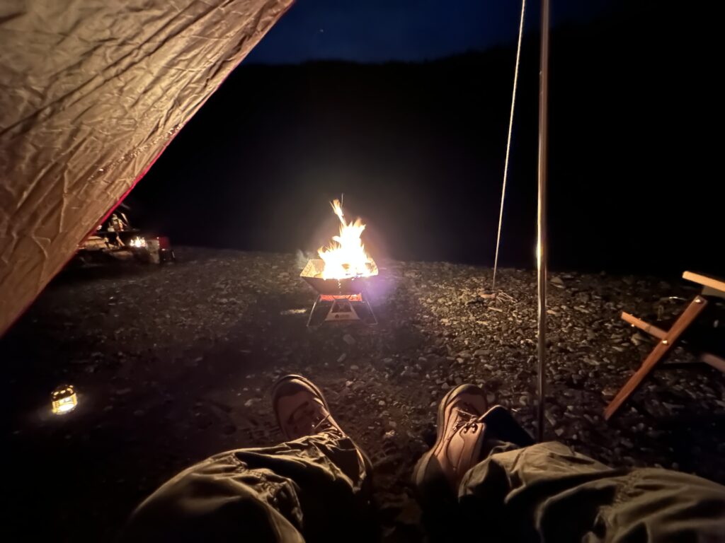 ヘキサタープは高さが低いので、通常サイズのチェアより、地面に座るくらい低いチェアがあるとより焚火の臨場感を楽しめると思う。今回は下の写真のように、シートを引いて焚火を堪能した!