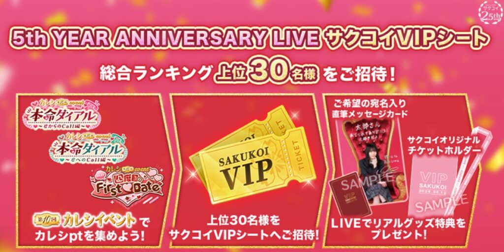 さらに今回のカレシイベントは、全編通算の総合ランキングがあり、入賞した上位30名様を櫻坂46「5th YEAR ANNIVERSARY LIVE」にご招待になります。